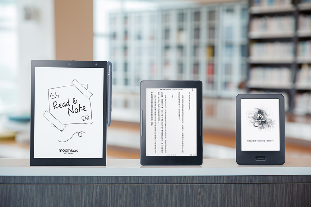Readmoo推出的各種尺寸閱讀器,由左至右為10.3吋、7.8吋及6吋。Readmoo讀墨電子書提供